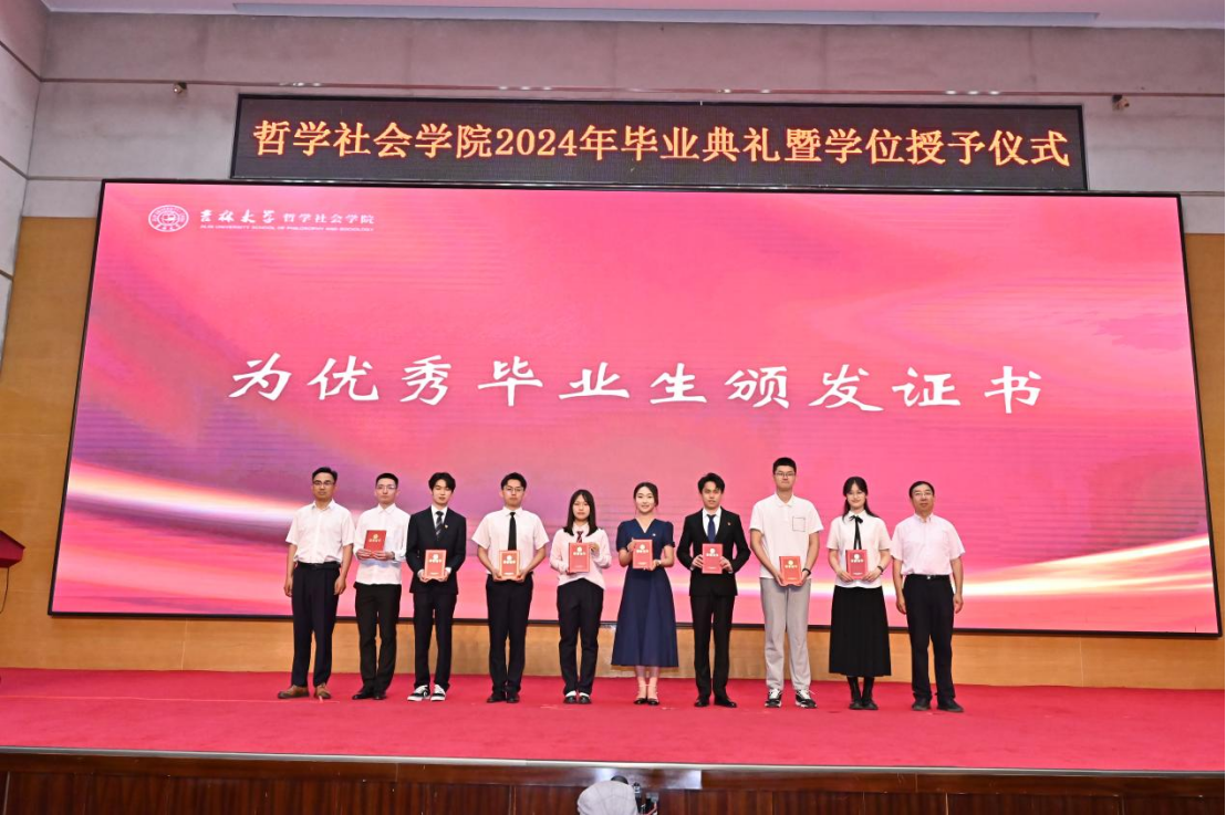 典礼第三项,党委副书记、纪委书记赵洁,基础理论研究中心副主任李生琦为研究生优秀毕业生颁发证书;副院长朱文君,副院长李龙为本科生优秀毕业生颁发证书。主席台上,女奴