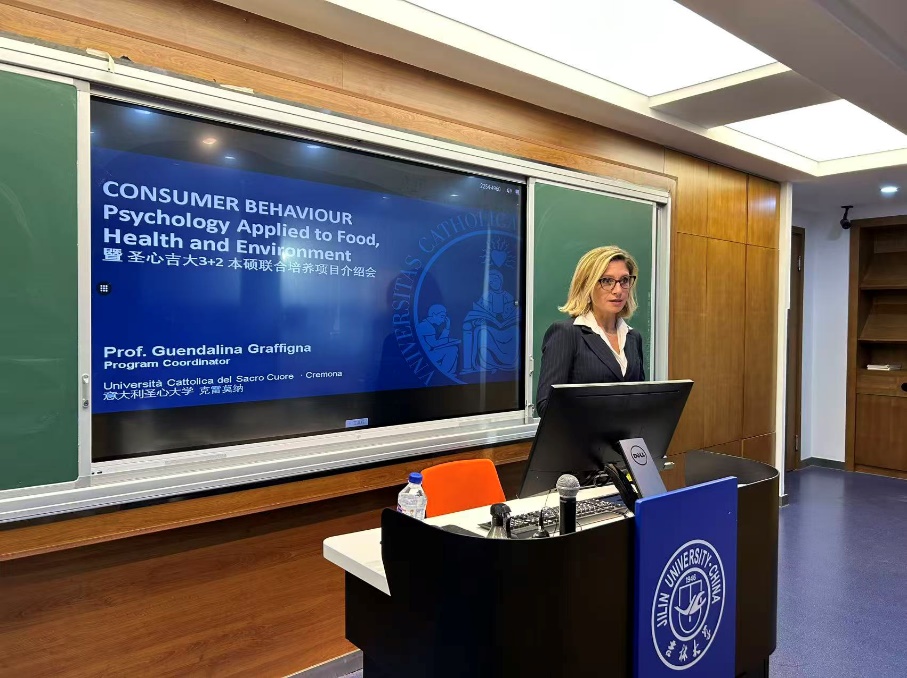 会上,Graffigna教授以“Psychological models and interventions for change health risks behaviours(理解与改变健康风险行为:心理模型与干预方法)”为题作了专题报告,系统阐述了健康风险行为的心理机制及干预策略。随后,周老师详细介绍了意大利圣心大学以及联合培养项目的整体情况,并分享了目前正在圣心大学学习的2022级两位吉大学生的学习和生活情况。在互动环节,周老师对学生关心的学分、奖学金、就业、升学等问题进行了详细的解答。