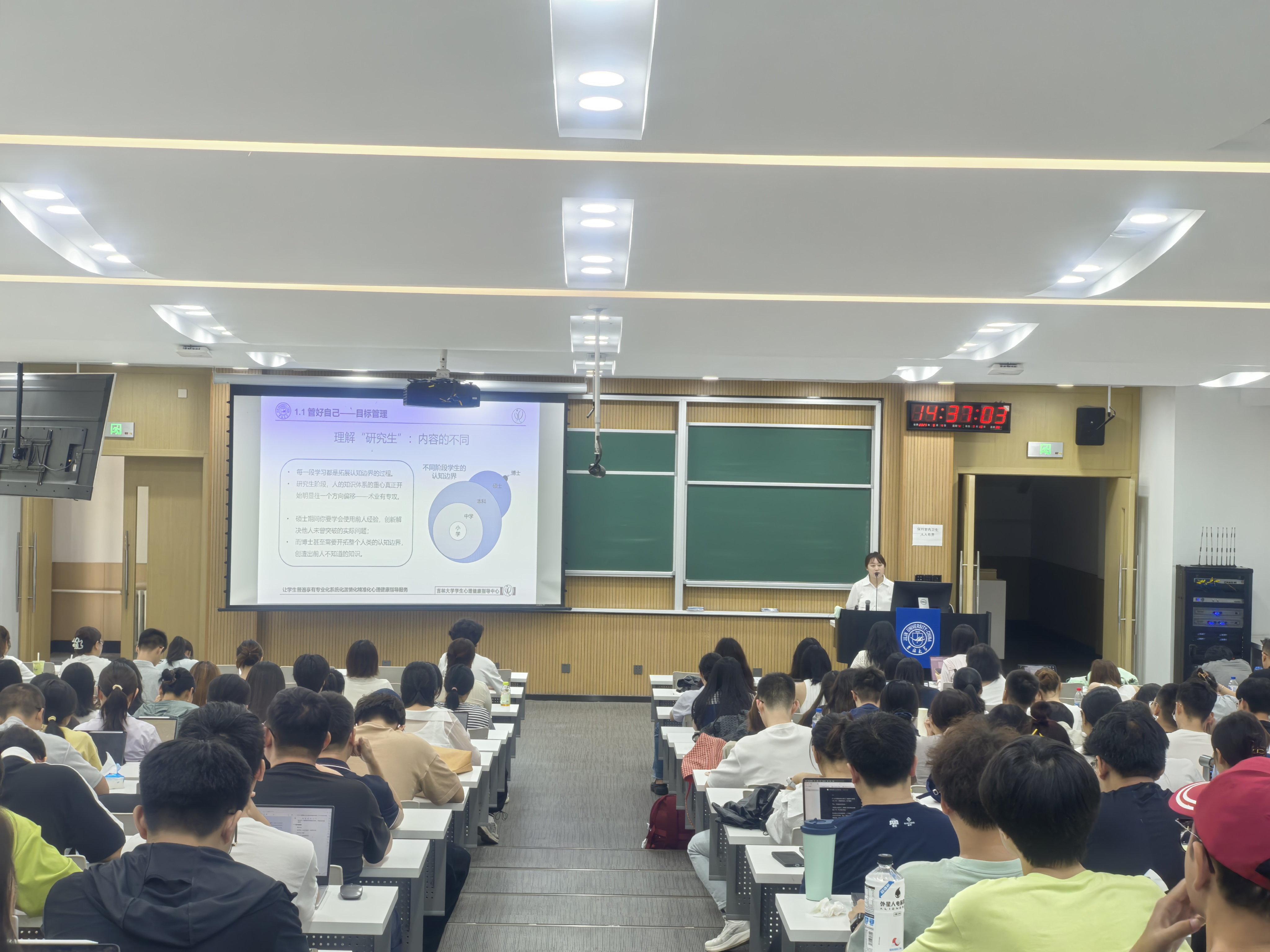 王老师围绕目标管理、压力管理和时间管理三大维度展开讲解,强调合理设定学习目标、科学缓解学业压力和高效安排时间的重要性,并传授实用技巧,助力新生掌握自我调控的科学方法。