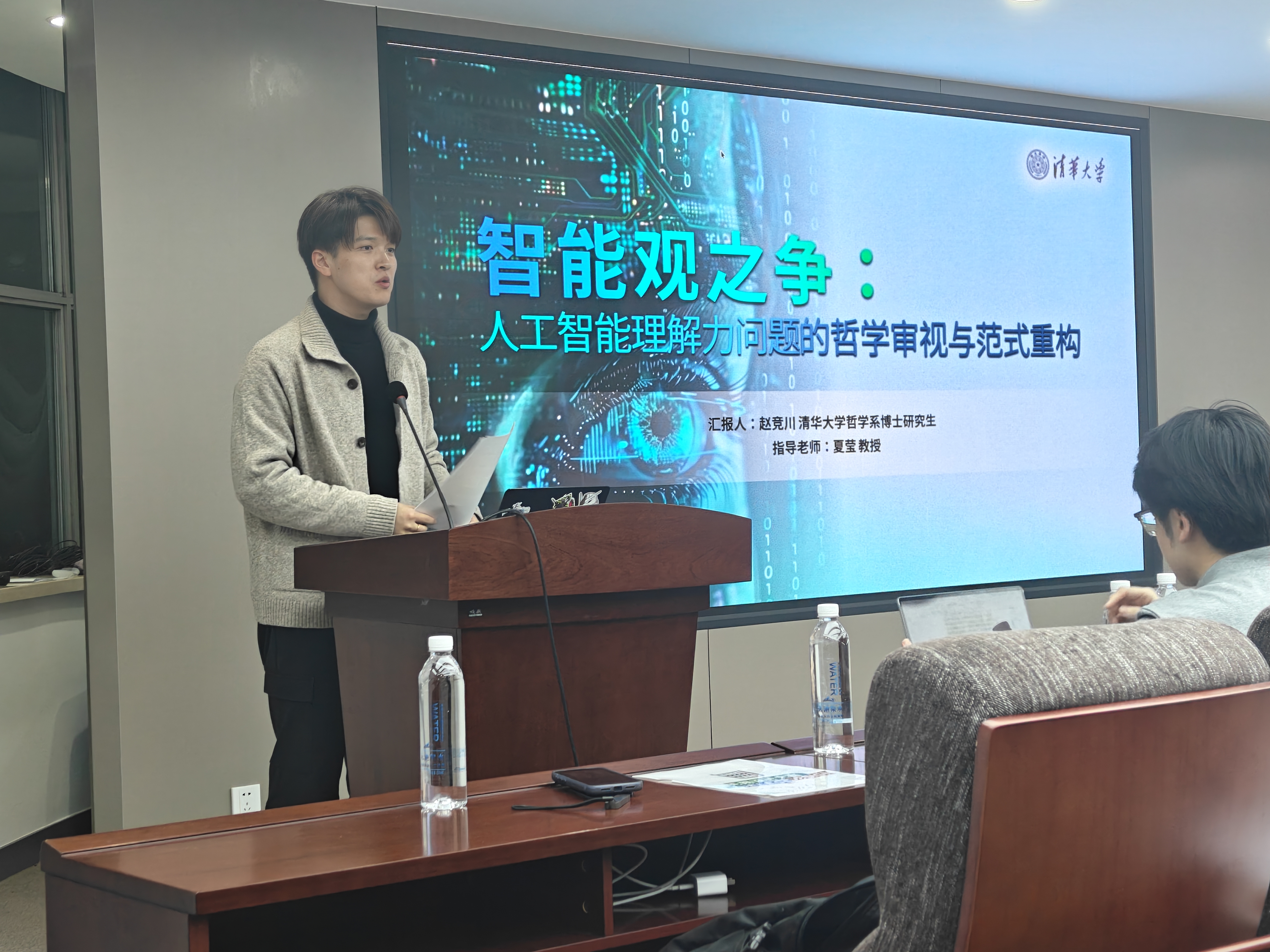首先,赵竞川简要介绍了他的论文《智能观之争:人工智能理解力问题的哲学审视与范式重构》。赵竞川谈到,所谓人工智能的“理解力之争”,是关于人工智能是否具有理解能力的讨论,主要争议双方是人本主义和结果主义。但双方所持的人工智能的“拟人性”和“合理性”的智能观,实质上都在否认人工智能的独立的认知主体地位,因为二者都属于人类中心主义,从而陷入了“主体性形而上学”框架。实际上,通过对人工智能“智能体(agent)”概念的分析,和对现代哲学的反主体思潮的思考,可以阐明一种能够赋予人工智能独立认知主体地位的智能观,即主张“智能”是指智能体在与经验世界的交互中,被动生成的一种具有不可预测性和创造性的行动能力。于是,理解力的内涵就被重构为智能体在把握必然性逻辑后,进一步把握必然性之外的“差异”的能力。这将改变关于“理解力之争”观点的“二元对立”状态,并使之转向对不同人工智能模型理解程度的具体分析。